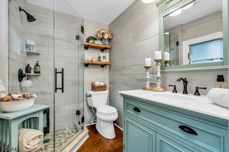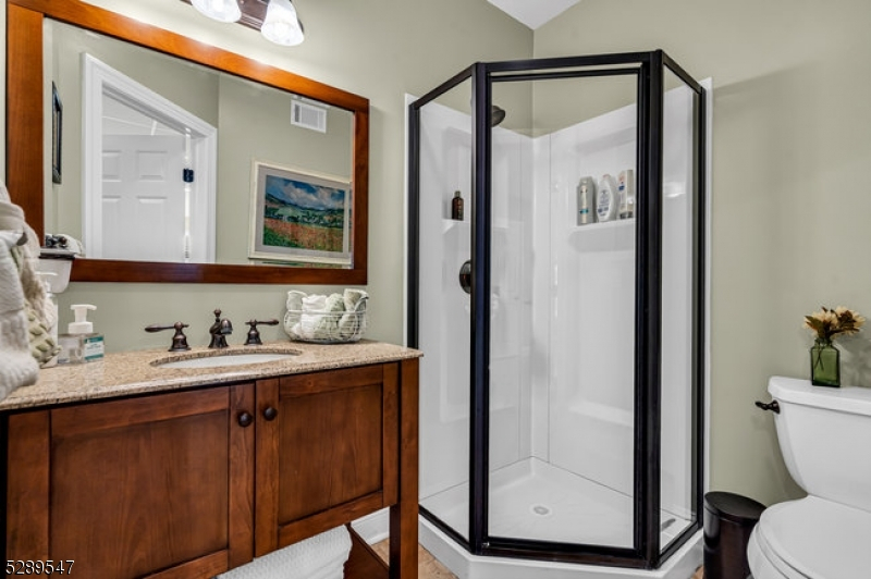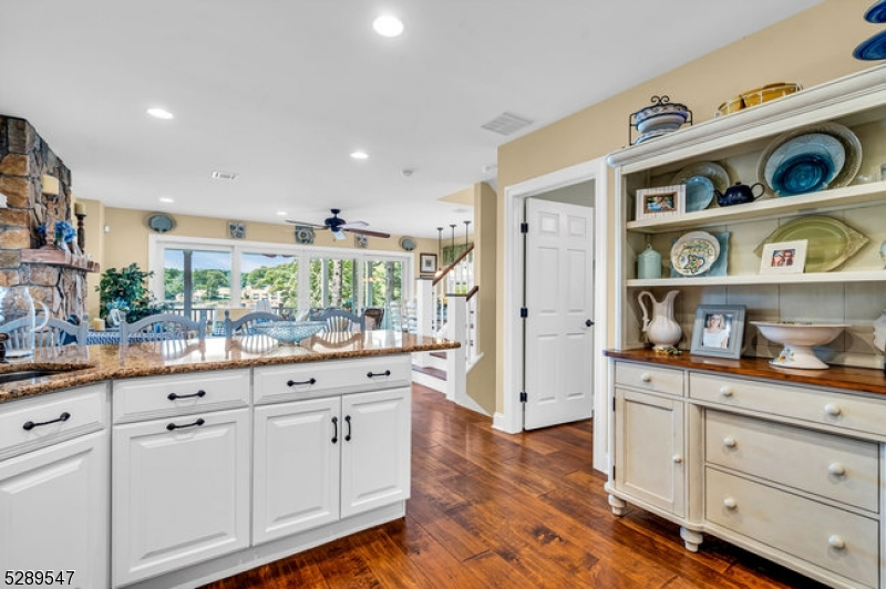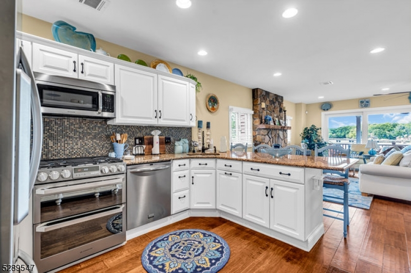 Stylish lakefront. Spectacular lake view from the covered porch. Enjoy those lazy summer days and evenings for dining and lounging around the gas firepit. An open floorplan designed to entertain. Custom well-appointed kitchen boasting stainless appliances, wood cabinetry, granite countertops, and a breakfast bar that opens to the living/dining room with views to the gas fireplace and covered porch. This 5-bedroom home offers a 1st-floor full bedroom w/full bath in the hall and first-floor laundry rm. 4 additional bedrooms include the primary bedroom with a walk-in closet and ensuite bath facing the lake. 3 additional bedrooms and a full guest bath. The finished lower level offers a flexible floor plan to add a kitchen as there is a full bath and a spacious open floor plan for your lakeside living. Two sets of glass slider doors lead out to the patio overlooking the lake. This home shares a common area lakefront and dock. So many interior and exterior details that make this home maintenance-free! Be in for this summer and enjoy NJ's largest lake, just one hour to NYC with local rail service. Walk to town location for restaurants, shops, house of worship, and nearby town park. Enjoy motor boats, kayaks, jet skis, and more as this community offers scenic year-round living with access to hiking, biking, golf/tennis resorts and winter activities on the lake.