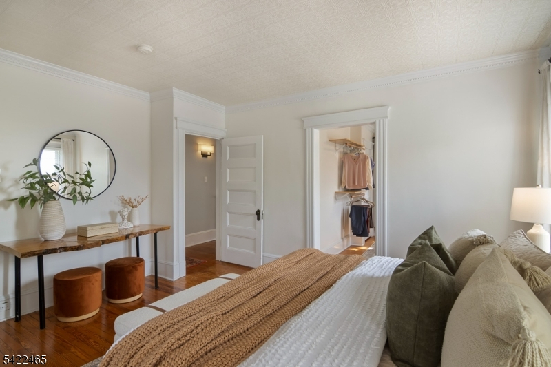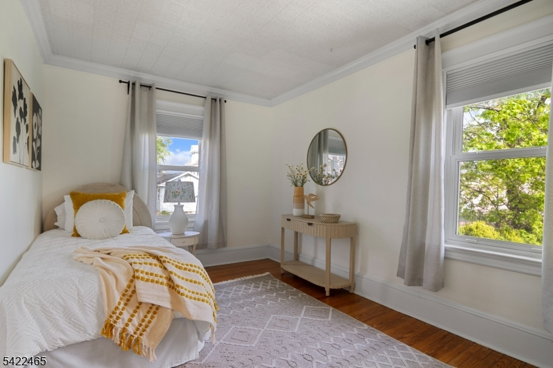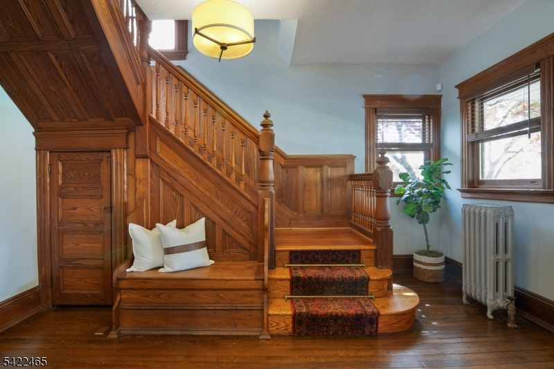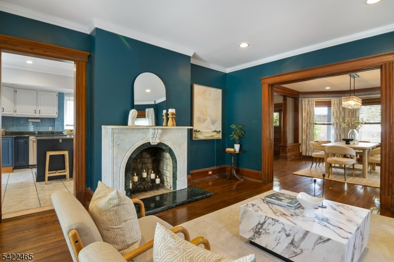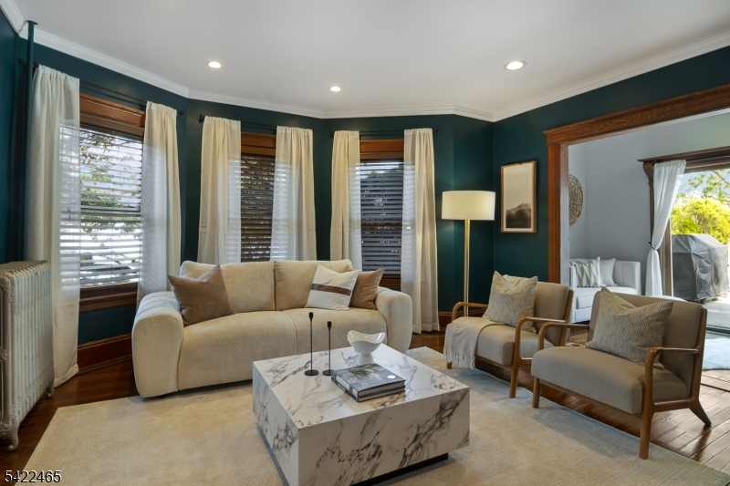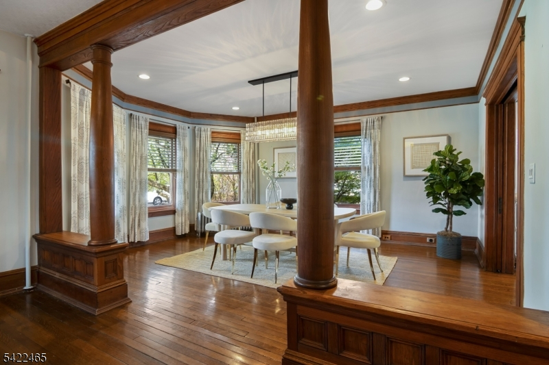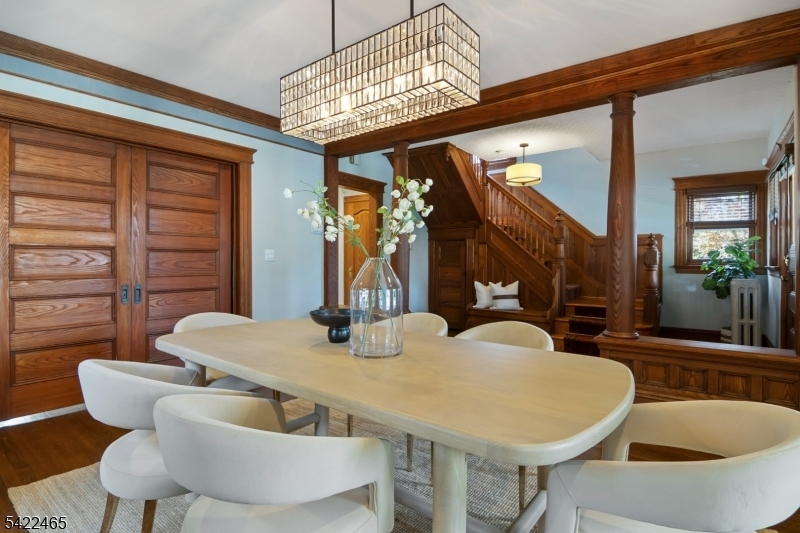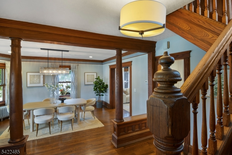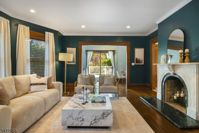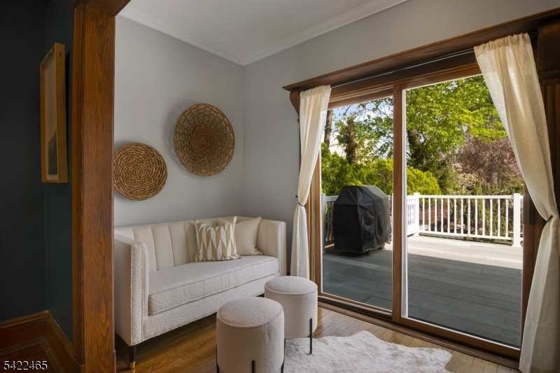 Welcome to this large, beautiful colonial filled to the brim with period-details and modern amenities. Walking in, you're greeted by the striking formal entryway with American chestnut trim work which leads into the large formal dining room. Sliding doors separate the dining room from the formal living room with decorative marble fireplace. Beyond the living room is a sunroom with sliders to the deck. A bright eat-in kitchen, powder room, and mudroom/laundry room complete the first floor. Upstairs, there are four generously-sized bedrooms, including the huge primary bedroom with adjoining dressing room and plenty of closet space. The recently renovated, custom, full bathroom has a large shower, deep soaking tub, exposed brick, and plenty of storage. The third floor is perfectly appointed for an au-pair or extended guests, with its own living room, bedroom, kitchenette, and full bathroom, which is accessed via a spiral stairwell from the second floor OR via its own private exterior stairwell. The basement is full, unfinished and dry, with a beautifully restored stone foundation.The backyard is a hidden oasis, with a large composite deck with awning overlooking a pond and a yard of garden beds. There is parking for 8+ cars available in the driveway, in addition to the detached two-car garage.Conveniently located within steps of downtown Bloomfield Ave's shopping and restaurants, schools and houses of worship, bus service to NYC, and a short walk to Grover Cleveland Park.